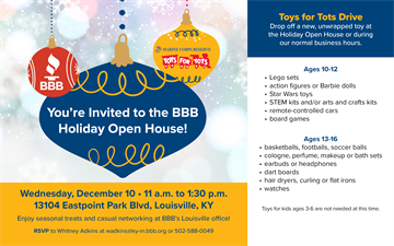 BBB Holiday Open House BBB Holiday Open House Set a Reminder Enter your email address below to receive a reminder message. Email address Select the amount of Days before the event -- Select Days Before Event -- 1 Day 2 Days 3 Days 1 Week Captcha Validation Please complete the Captcha Submit Date and Time Wednesday Dec 10, 2025 11:00 AM - 1:30 PM EST Set a Reminder Enter your email address below to receive a reminder message. Email address Select the amount of Days before the event -- Select Days Before Event -- 1 Day 2 Days 3 Days 1 Week Captcha Validation Please complete the Captcha Submit Share × Print Email Add to Calendar Facebook Twitter LinkedIn Tell a Friend × Select Calendar Type × Google Yahoo iCal (Outlook, Apple, or other)